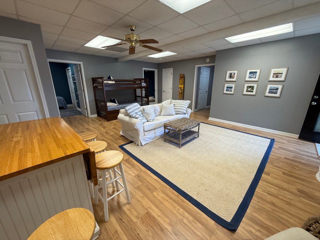 upstairs: 3 bedrooms + 3.5 baths. downstairs: 1 bedroom, 1 bathroom, additional bunk beds, game room, kitchenette and more.